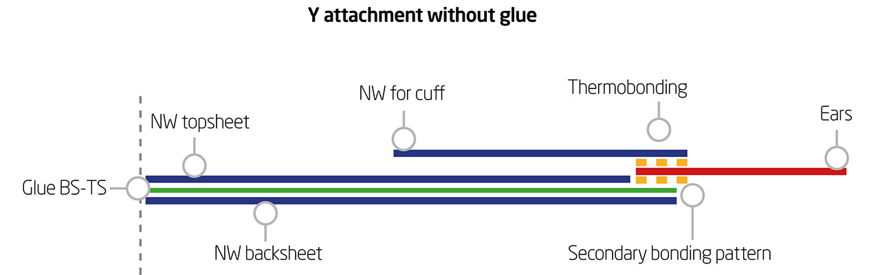 The removal of more than 65% of glue, by using alternative bonding technology for diaper manufacture, assisted by the improved design of glueless diapers, has led to a reduction in material requirements and a saving of manufacturing energy.